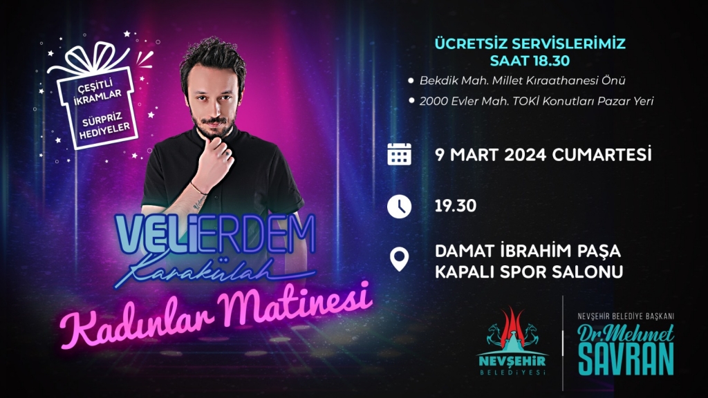 Nevşehir Belediyesi tarafından, Dünya Kadınlar Günü dolayısıyla Nevşehirli kadınlar için ‘Kadınlar Matinesi’ düzenlenecek. Nevşehir Belediyesi Kültür ve Sosyal İşler Müdürlüğü tarafından gerçekleştirilecek olan ‘Kadınlar Matinesi’, 9 Mart Cumartesi akşamı Damat İbrahim Paşa Kapalı Spor Salonu’nda yapılacak. Ünlü sanatçı Veli Erdem Karakülah’ın sahne alacağı etkinlik 9 Mart Cumartesi akşamı gerçekleştirilecek. Nevşehirli tüm kadınların ücretsiz olarak katılabilecekleri […]