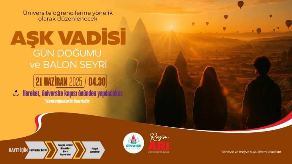 Nevşehir Belediyesi Gençlik ve Spor Hizmetleri Müdürlüğü tarafından üniversite öğrencilerine yönelik gün doğumu ve balon seyri etkinliği düzenlenecek. Nevşehir’in İl oluşunun 70. Yılı kapsamında yapılacak olan etkinlik günün ilk ışıklarıyla harika manzarası olan Göreme Aşk Vadisi’nde gün doğumunu ve sıcak hava balonlarının kalkışını seyretmek isteyen üniversite öğrencileri için bir fırsat olarak bildirildi. Eğitim öğretim yılının […]