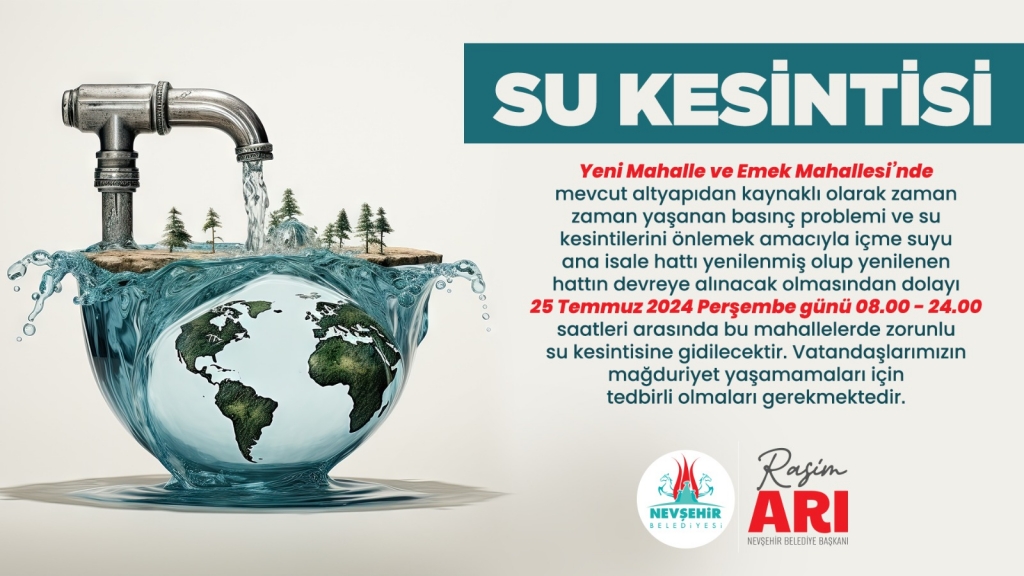 Nevşehir Belediyesi tarafından gerçekleştirilen altyapı yenileme çalışmalarından dolayı, 25 Temmuz 2024 Perşembe günü 08.00-24.00 saatleri arasında Yeni Mahalle ve Emek Mahallesi’nde planlı su kesintisi yapılacak. Konuyla ilgili Nevşehir Belediyesi Su ve Kanalizasyon Müdürlüğü’nden yapılan açıklamada, “Yeni Mahalle ve Emek Mahallesi’nde mevcut altyapıdan kaynaklı olarak zaman zaman yaşanan basınç problemi ve su kesintilerini önlemek amacıyla içme […]
