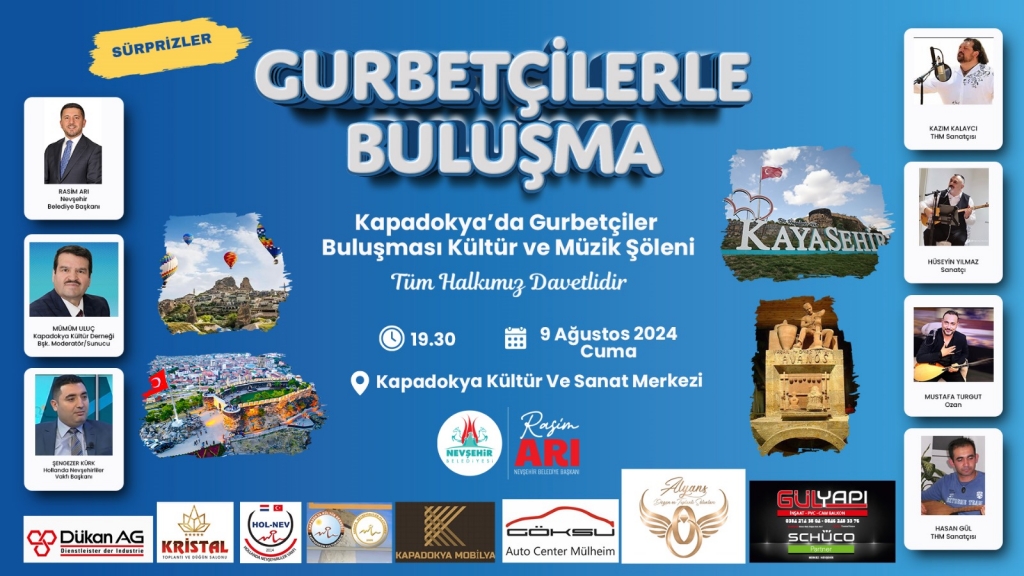 Gurbetçilerle Buluşma Programı, Nevşehir Belediyesi’nin ev sahipliğinde 9 Ağustos 2024 Cuma akşamı Kapadokya Kültür ve Sanat Merkezi’nde yapılacak. Kapadokya Kültür Derneği ve Hollanda Nevşehirliler Vakfı tarafından düzenlenen Kapadokya Gurbetçiler Buluşması Kültür ve Müzik Şöleni Programı’na Nevşehir Belediyesi ev sahipliği yapacak. 9 Ağustos 2024 Cuma akşamı Kapadokya Kültür ve Sanat Merkezi’nde gerçekleştirilecek olan program saat 19.0’da […]